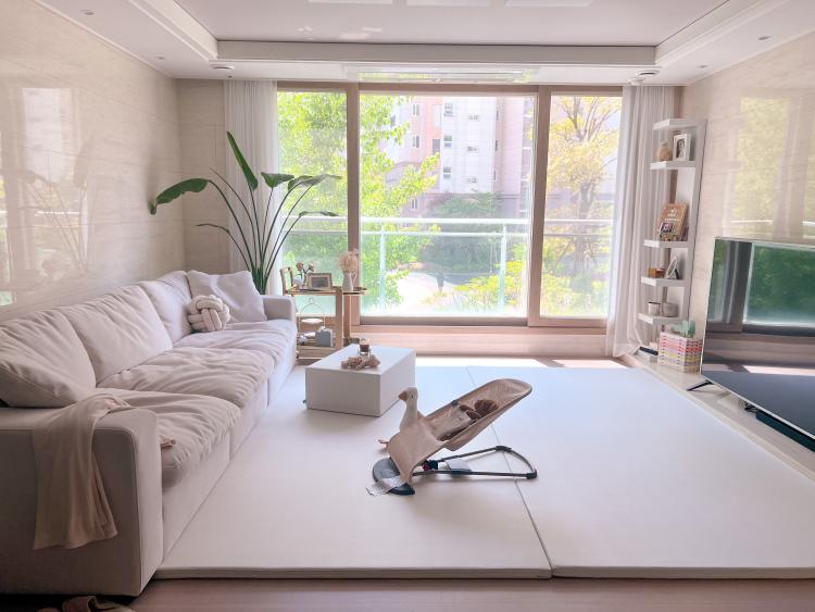 아이가 있는 집 거실이에요. 소파를 일자로 배치하니 거실이 더 넓어 보여요. 매트를 거실 바닥에 딱 맞게 깔아 청소하기도 간단하네요. 화이트 인테리어를 위해 하얀 장식장을 하나 들이고 싶어요.