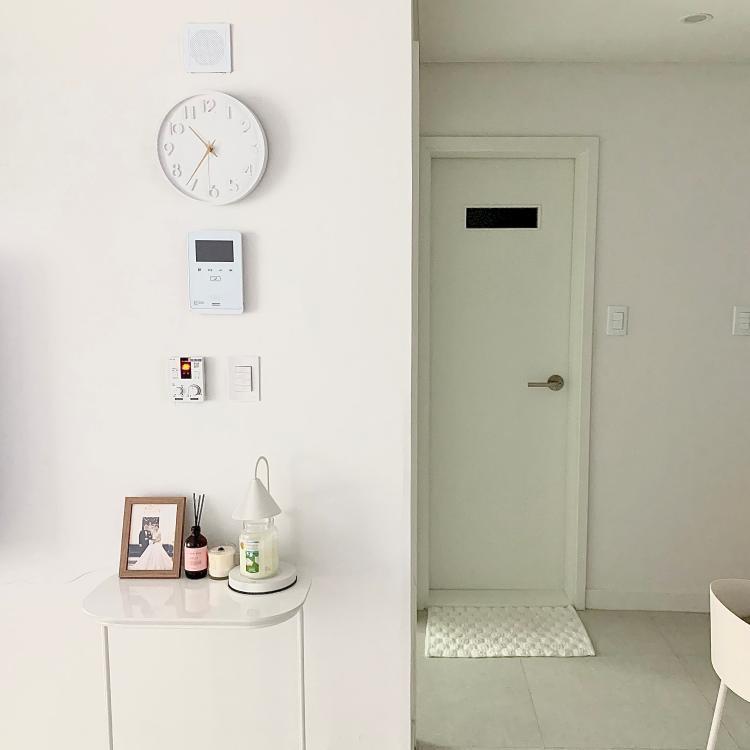 욕실문은 아쿠아유리로 포인트줬어요! 저희집이 궁금하시면 위에 블로그로 놀러오세요~🫶🏻