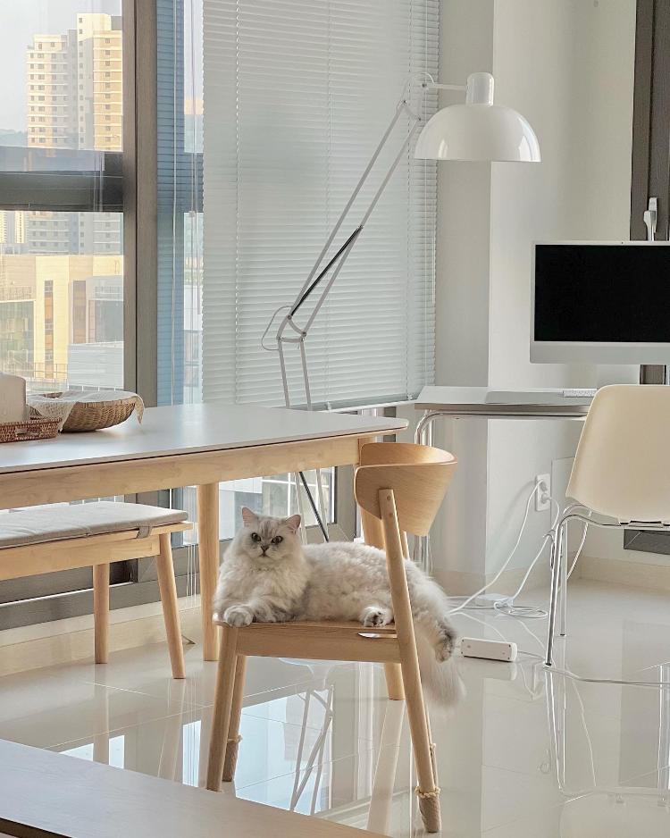 청소 하려고 빼놓은 의자에 냉큼 올라간 고양이🥹💓 채도 낮은 거실의 풍경에 활력을 불어 넣어 주네요 ㅋㅋ