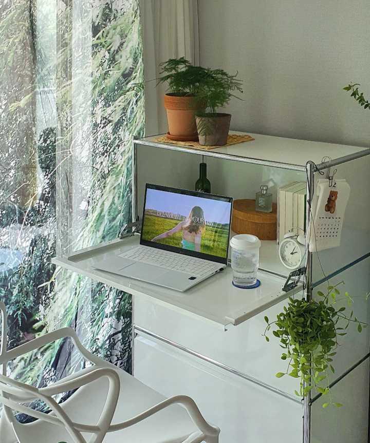 거실 한편이지만 소중한 내공간이예요(내방갖고싶다😊) 수납장을 간이 책상으로 활용해서 간단한 노트북작업하거나 영상도보고 시간보내면 기분이👍👍