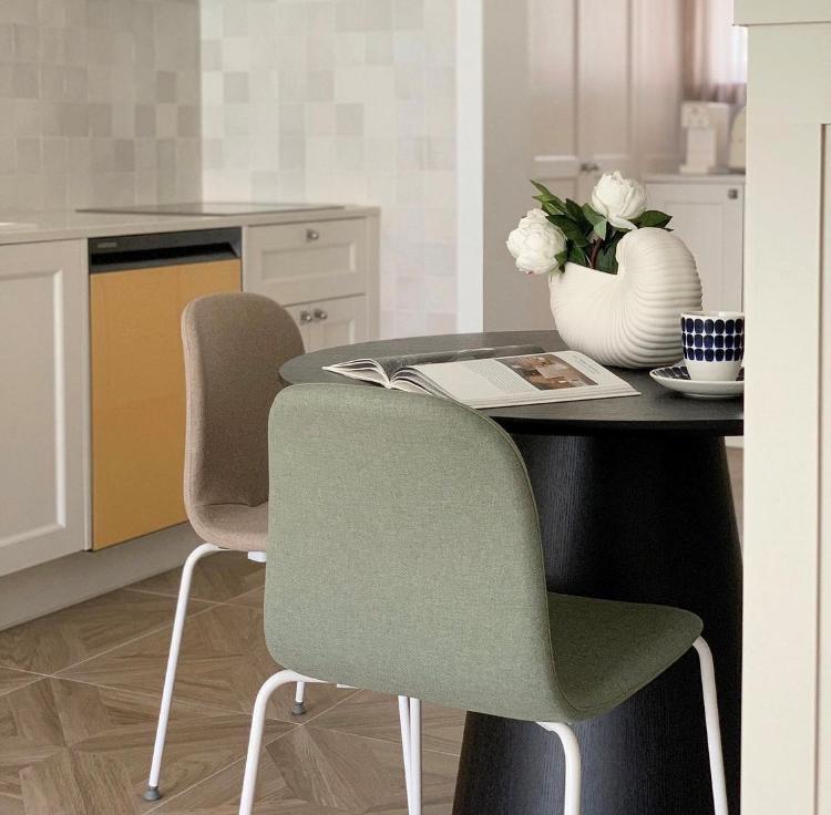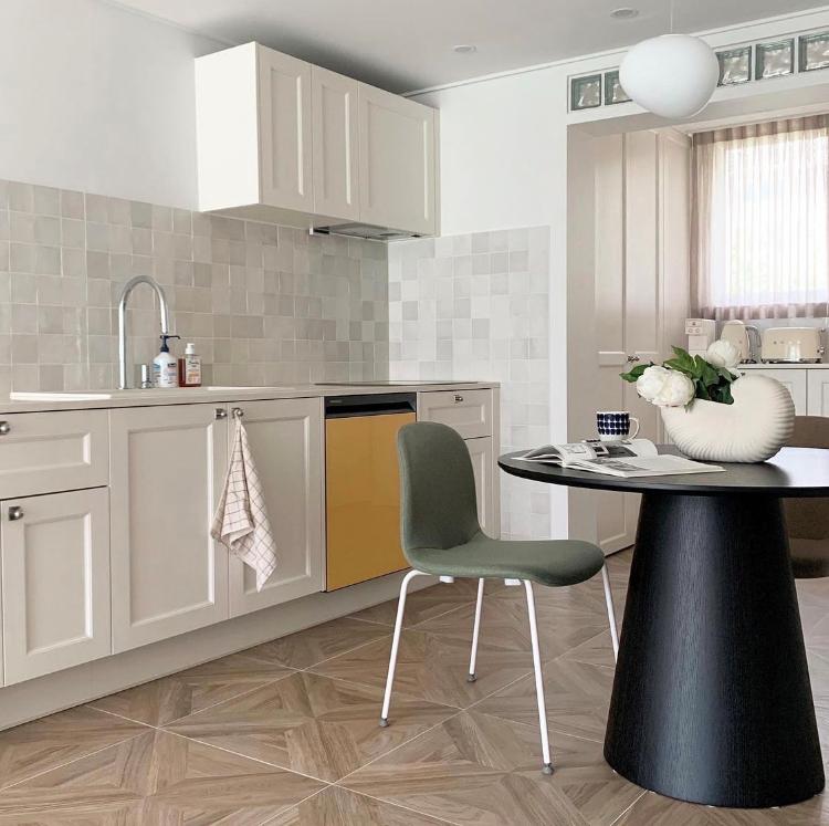 노란색 식기세척기가 포인트가 되는 주방!