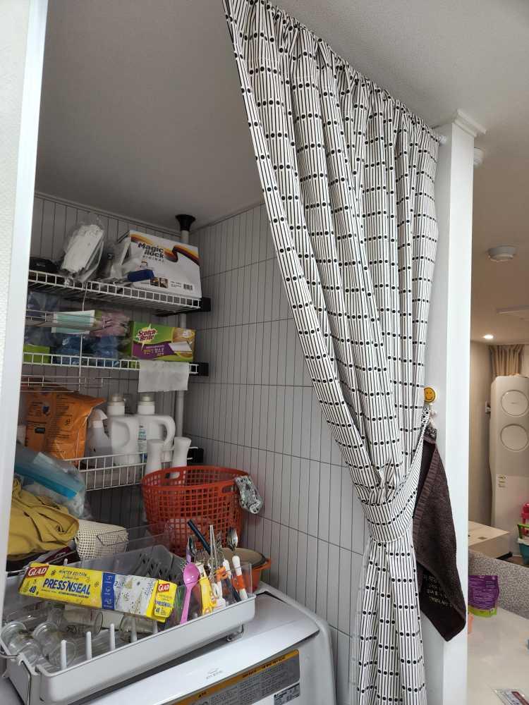 주방 한쪽 세탁기를 가리려고 커튼을 달았어요