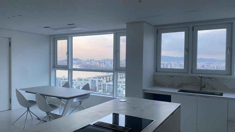 식탁과 쇼파로 거실을 채웠구요 후드를 없애고 매립형으로 공간감을 늘렸습니다