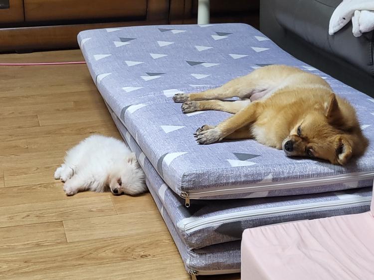 거실 매트 위에서 자는 우리집 갱얼쥐들🐶
