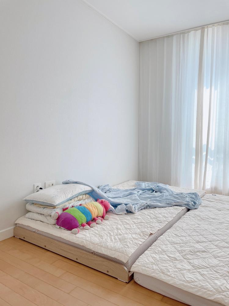 아이방으로 잠자리를 옮겼어요 :) 퀸사이즈와 슈퍼싱글 사이즈 메모리폼 매트리스를 붙여 놓으니 널찍하니 좋네요❤️