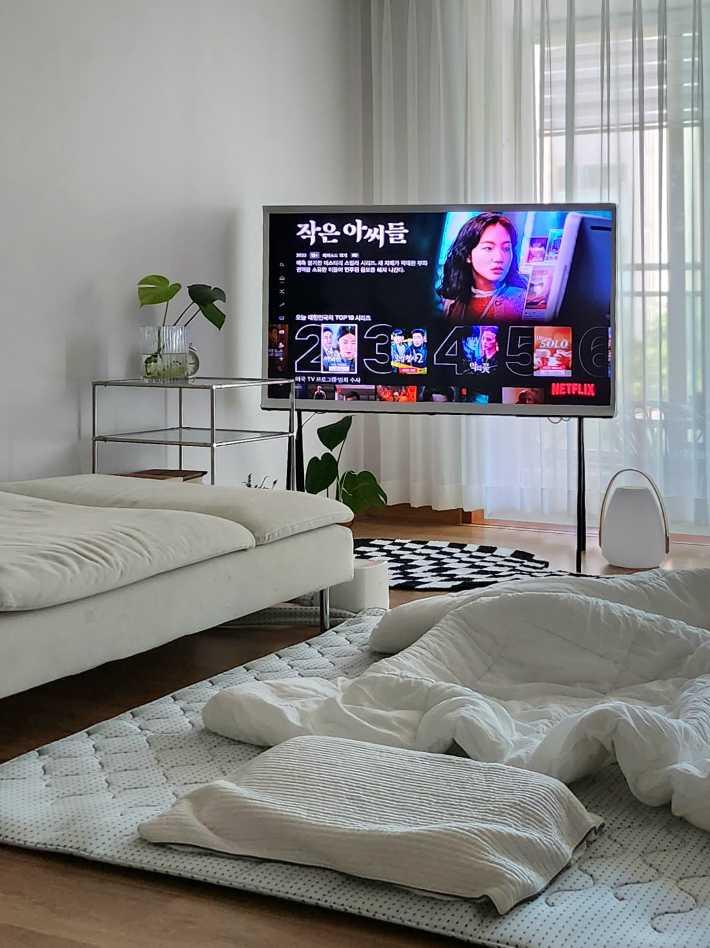 그냥 앉기는 마룻바닥이 차가운 계절이라 온수매트 깔아뒀어요. 여기서 뒹굴하며 드라마 보는 재미가 꿀이예요!