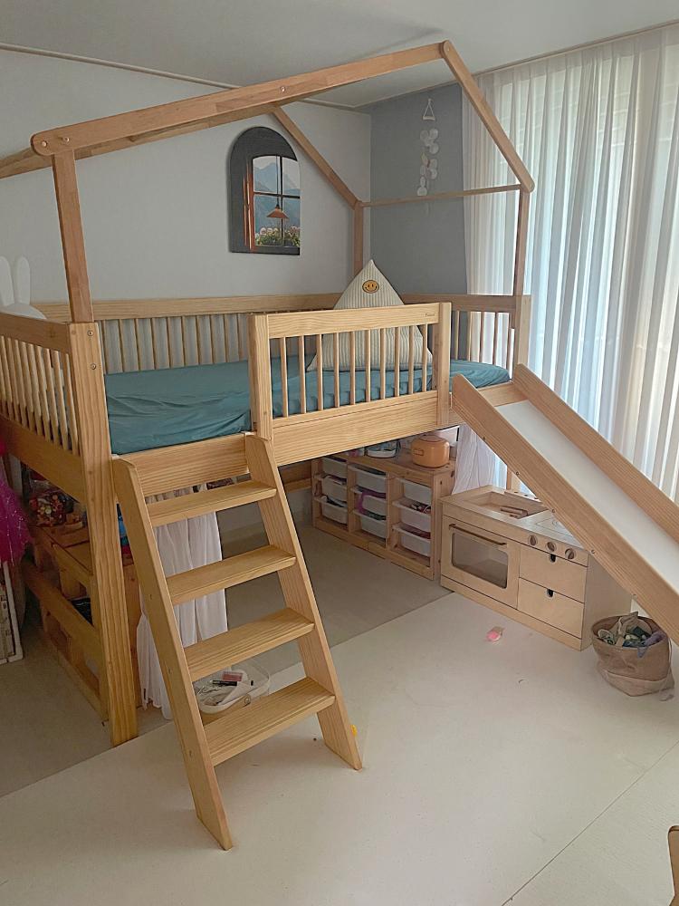 아이방 침대 1층 공간에 매트리스를 빼고 장난감 수납함을 넣어주었어요. 아이들이 오늘은 비밀아지트에서 병원놀이를.했어요