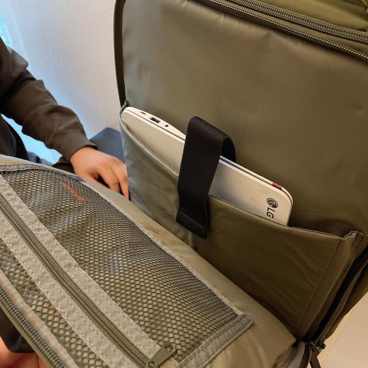 가방의 메인 부분에는 메쉬로 노트북을 고정해주는 칸이 따로 있어요 가방이 쫙 벌어지지않게 똑딱이와 부직포 찍찍이로 잡아주고 오픈하면 캐리어처럼 다 벌어져서 짐을 칸칸이 넣을 수 있습니다 ㅎㅎ