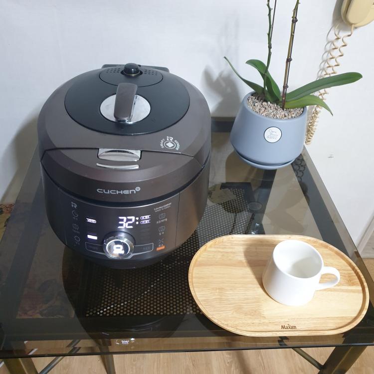 유리테이블 위 쿠쿠 밥솥과 화분 배치해놓았어요