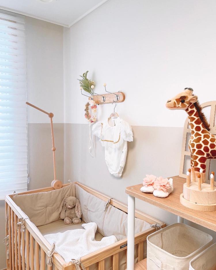 따뜻한 분위기를 좋아하는 저는 우드침대와 우드선반으로 아기방을 꾸며 주었어요🤎