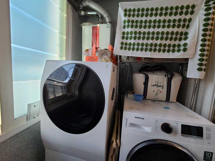 보기싫은 세탁기 선반은 티타월로 가려주고 세탁기 위 세제들은 커피캐리어로 정리해줬어요.