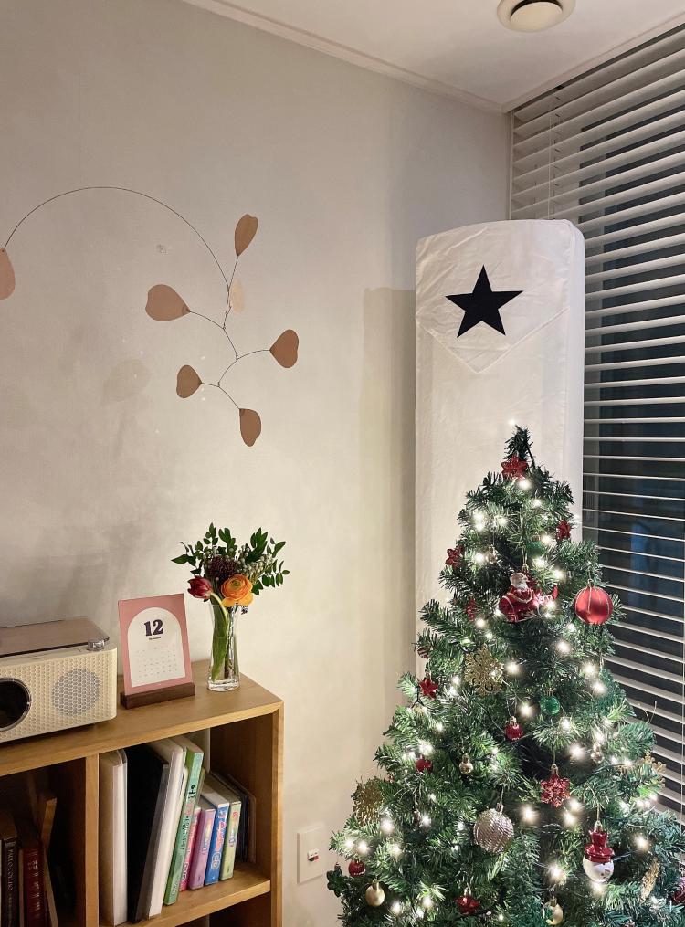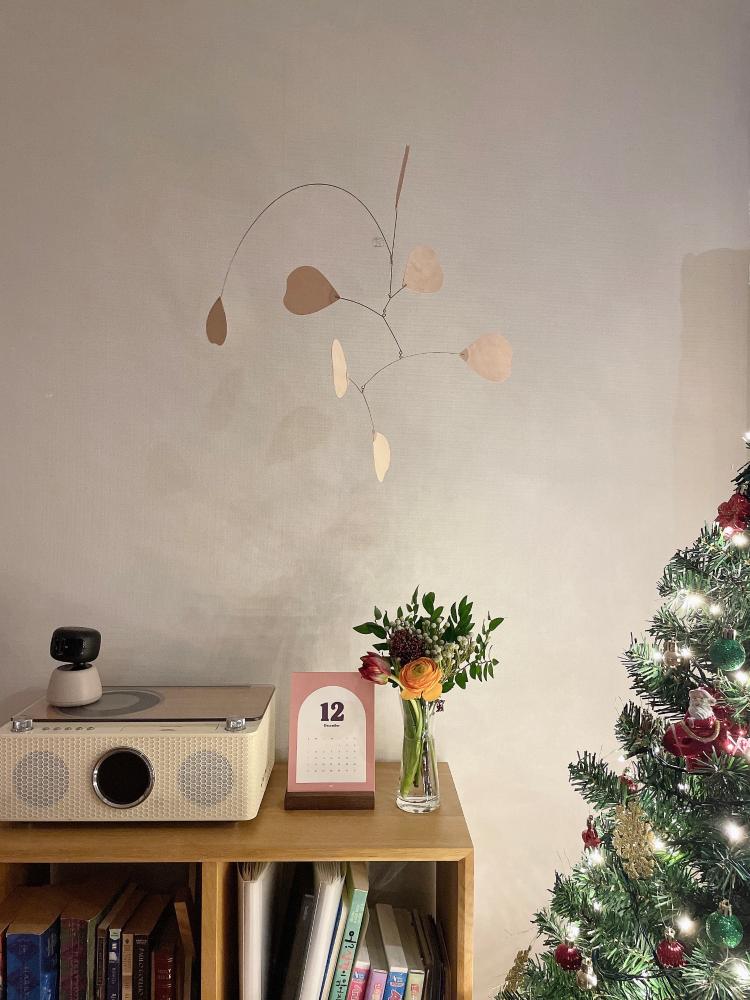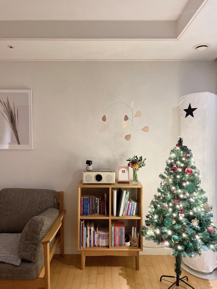 거실에 반짝이는 트리와 흔들리는 모빌을 보며