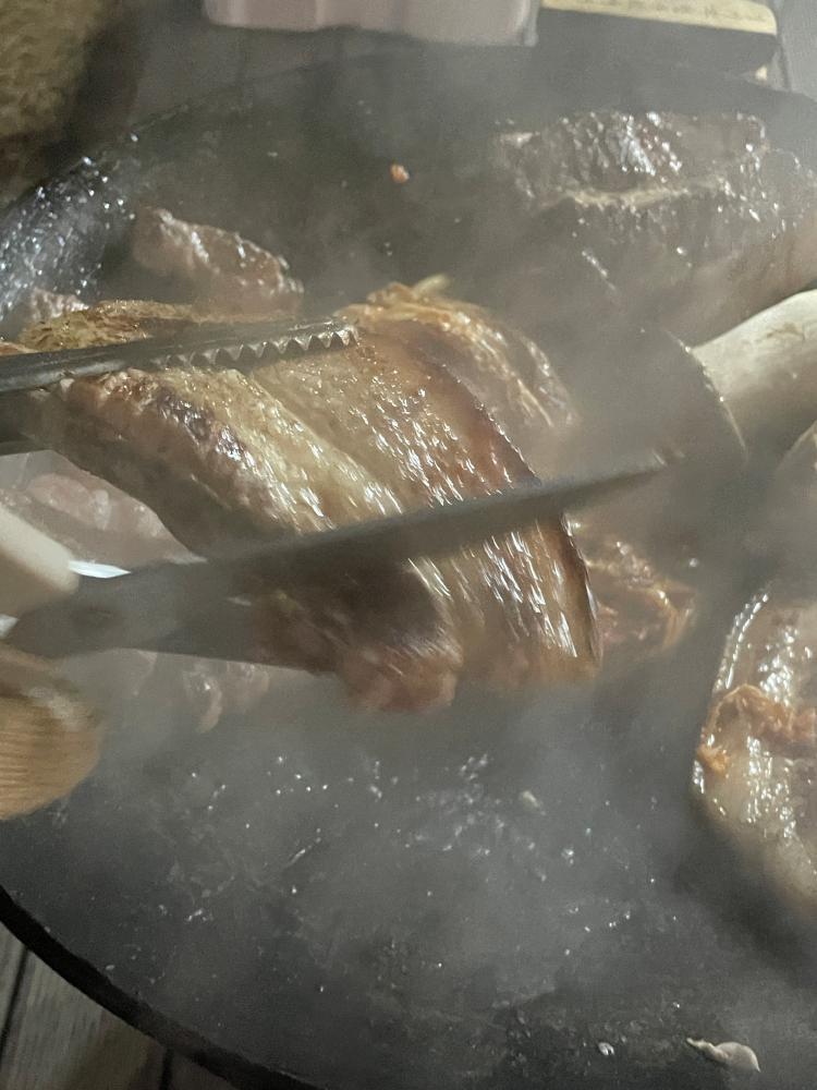 먼저 초벌로 장작불에 구워 준 후 그리들로 한번 더 구우면