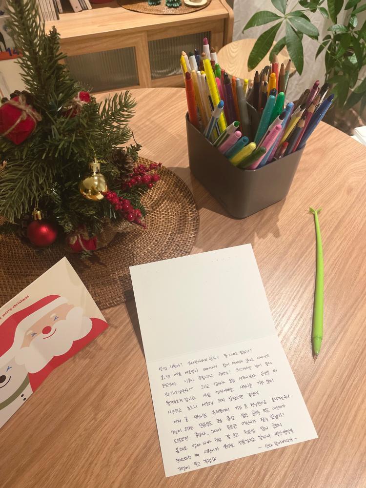 오늘은 다음주에 유치원에서 산타행사를 한다고 편지를 몰래 써오라고 하네요. 모두가 잠든 저녁 테이블에 앉아 편지를 적어봅니다:-)
